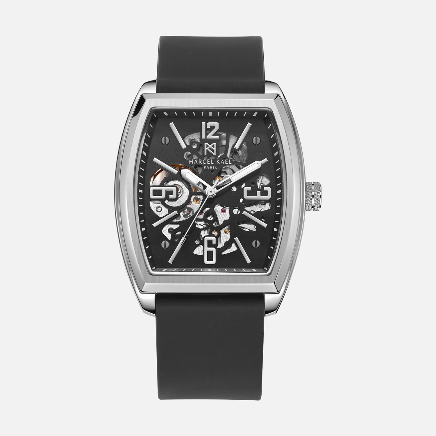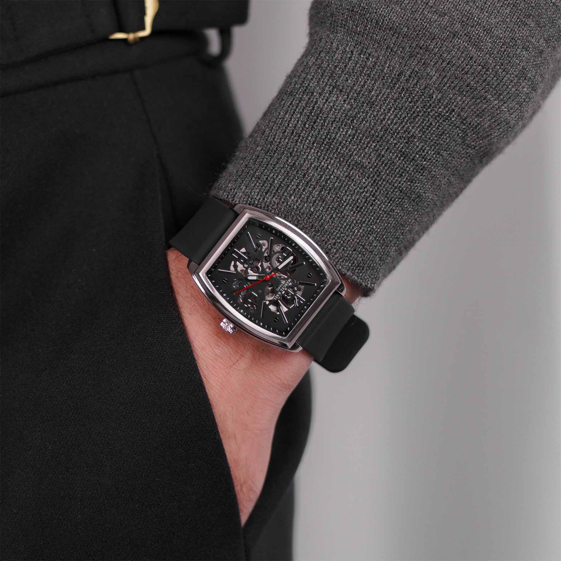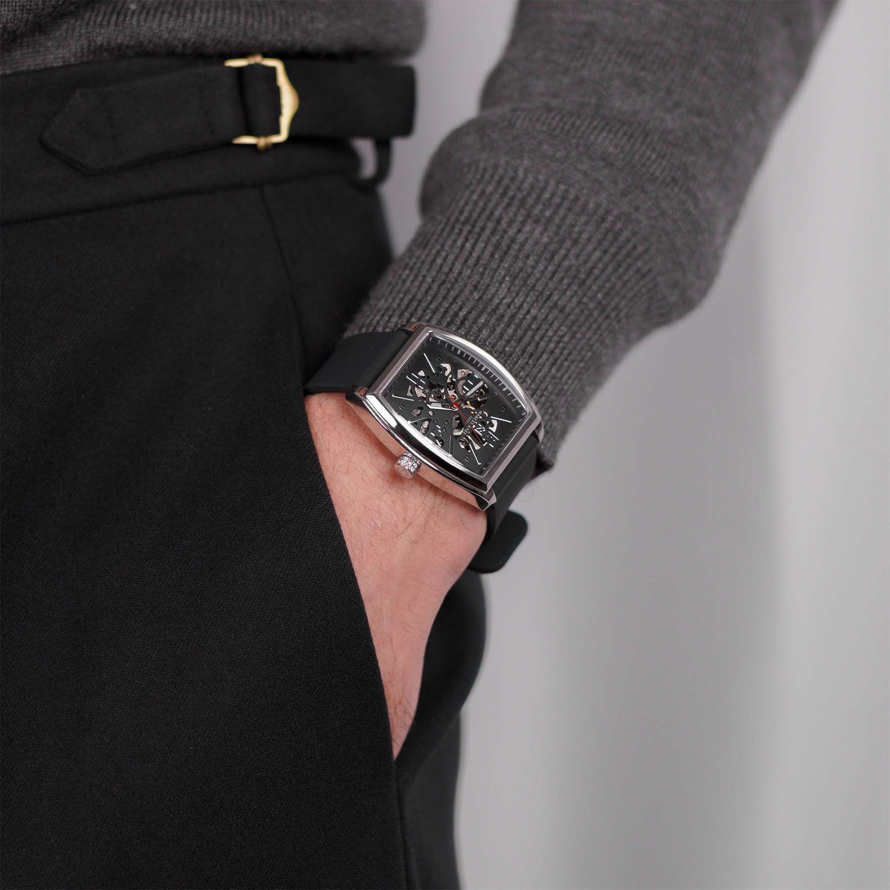 The Leontar Automatic Skeleton commands attention with its tonneau-shaped brushed stainless-steel case and open-worked dial, revealing the mechanics within. Powered by a self-winding movement and paired with a bold black strap, Leontar embodies strength, precision, and timeless style.