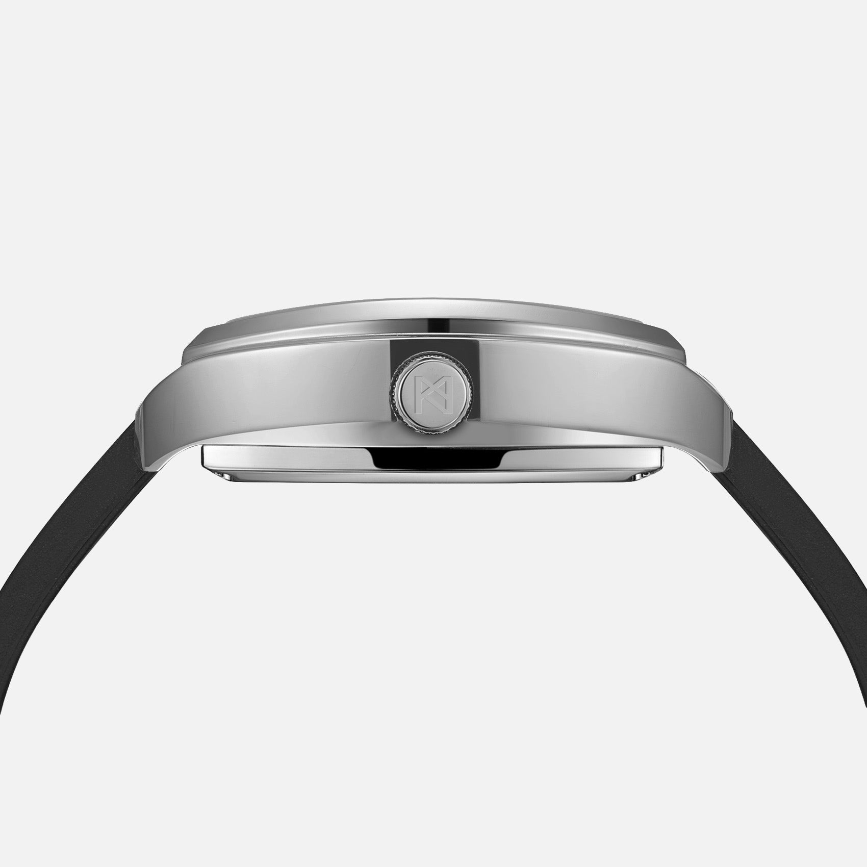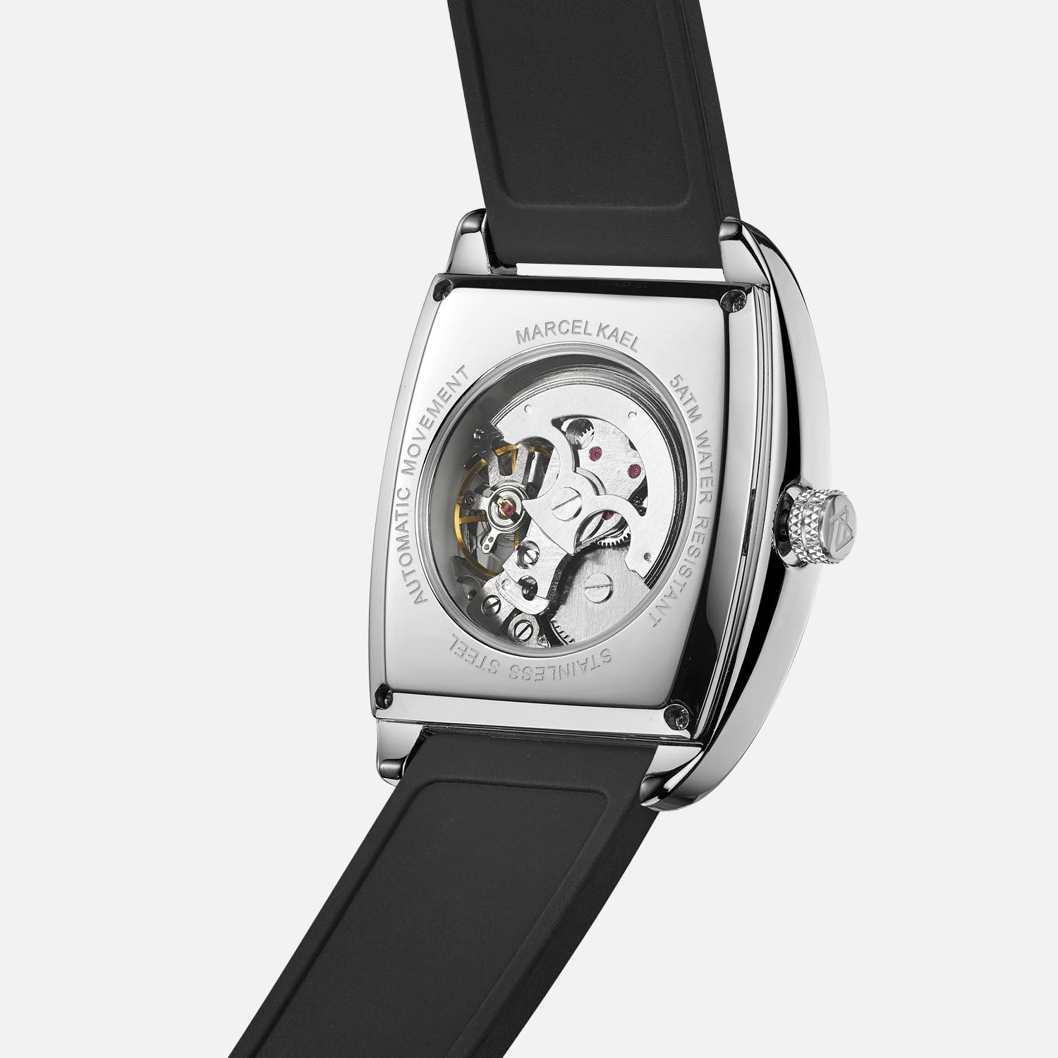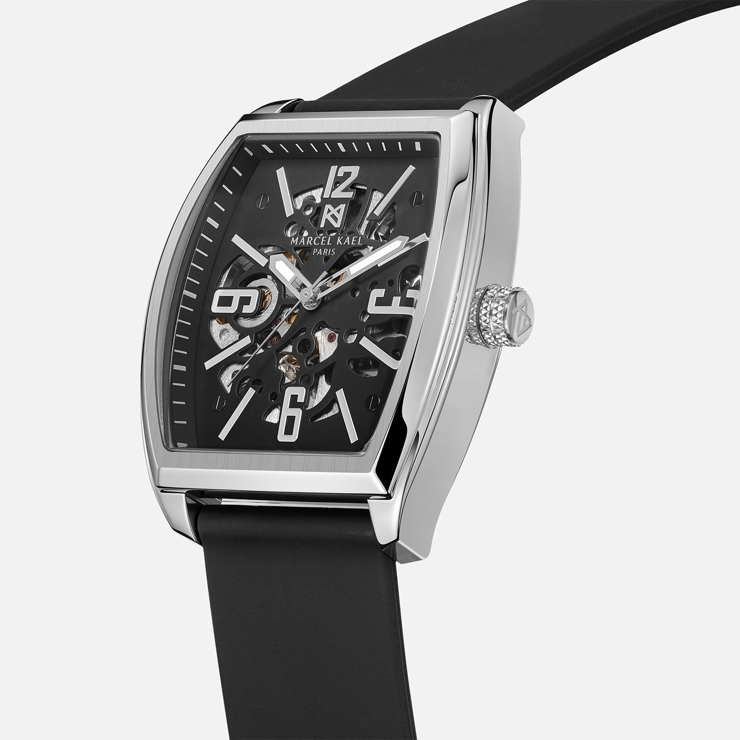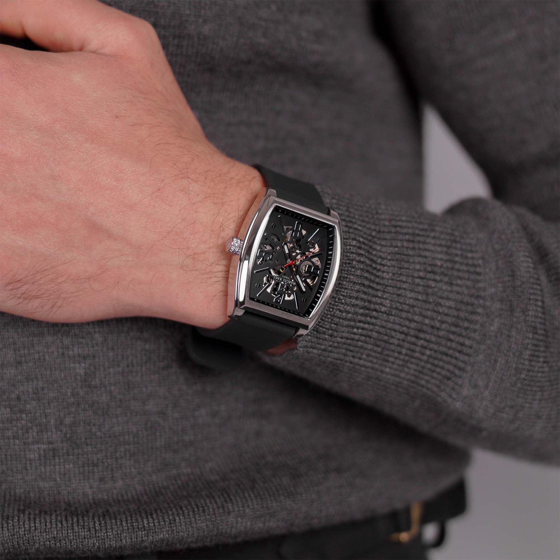 The Leontar Automatic Skeleton commands attention with its tonneau-shaped brushed stainless-steel case and open-worked dial, revealing the mechanics within. Powered by a self-winding movement and paired with a bold black strap, Leontar embodies strength, precision, and timeless style.