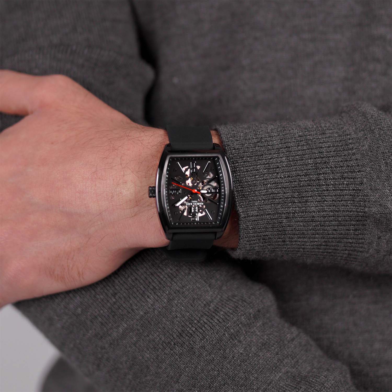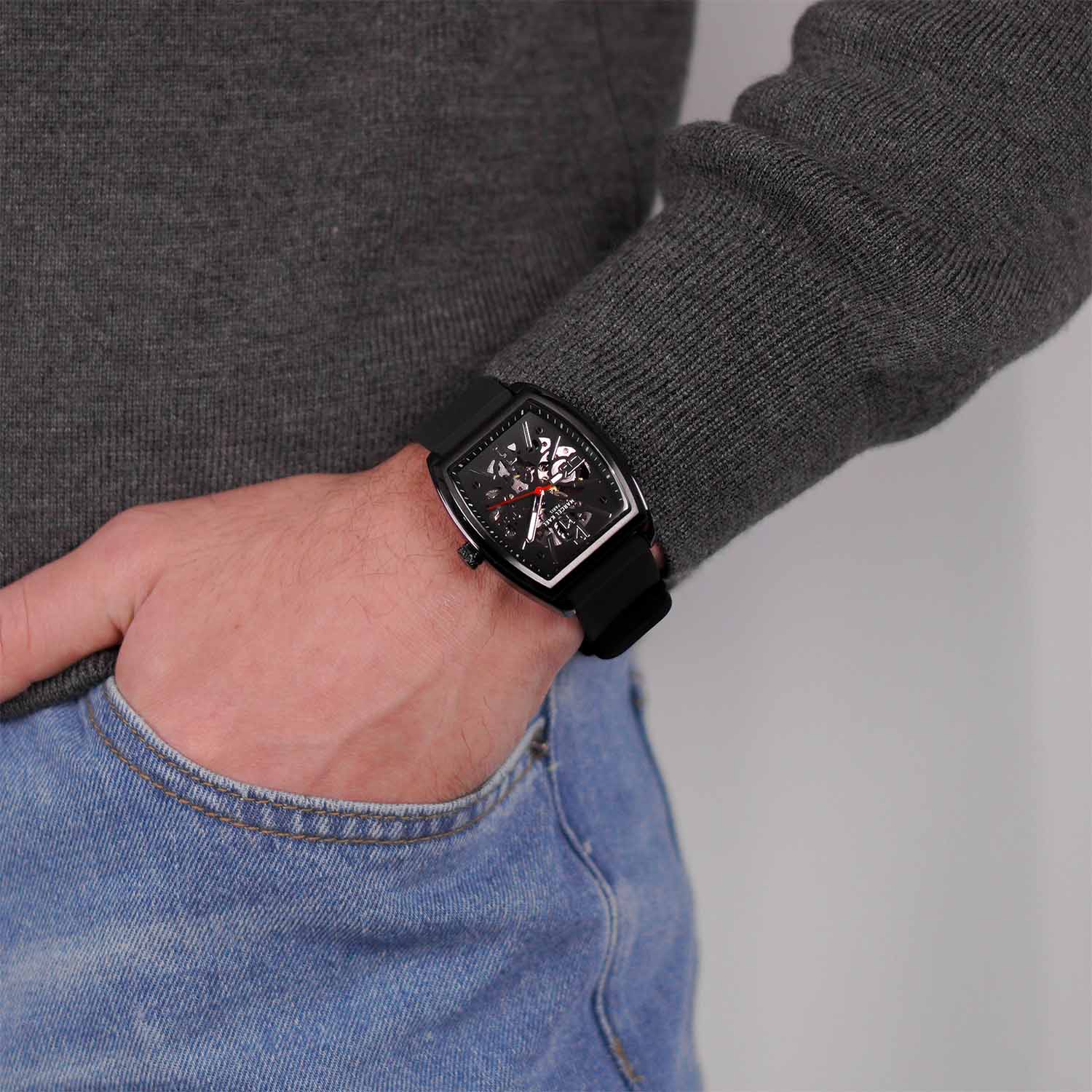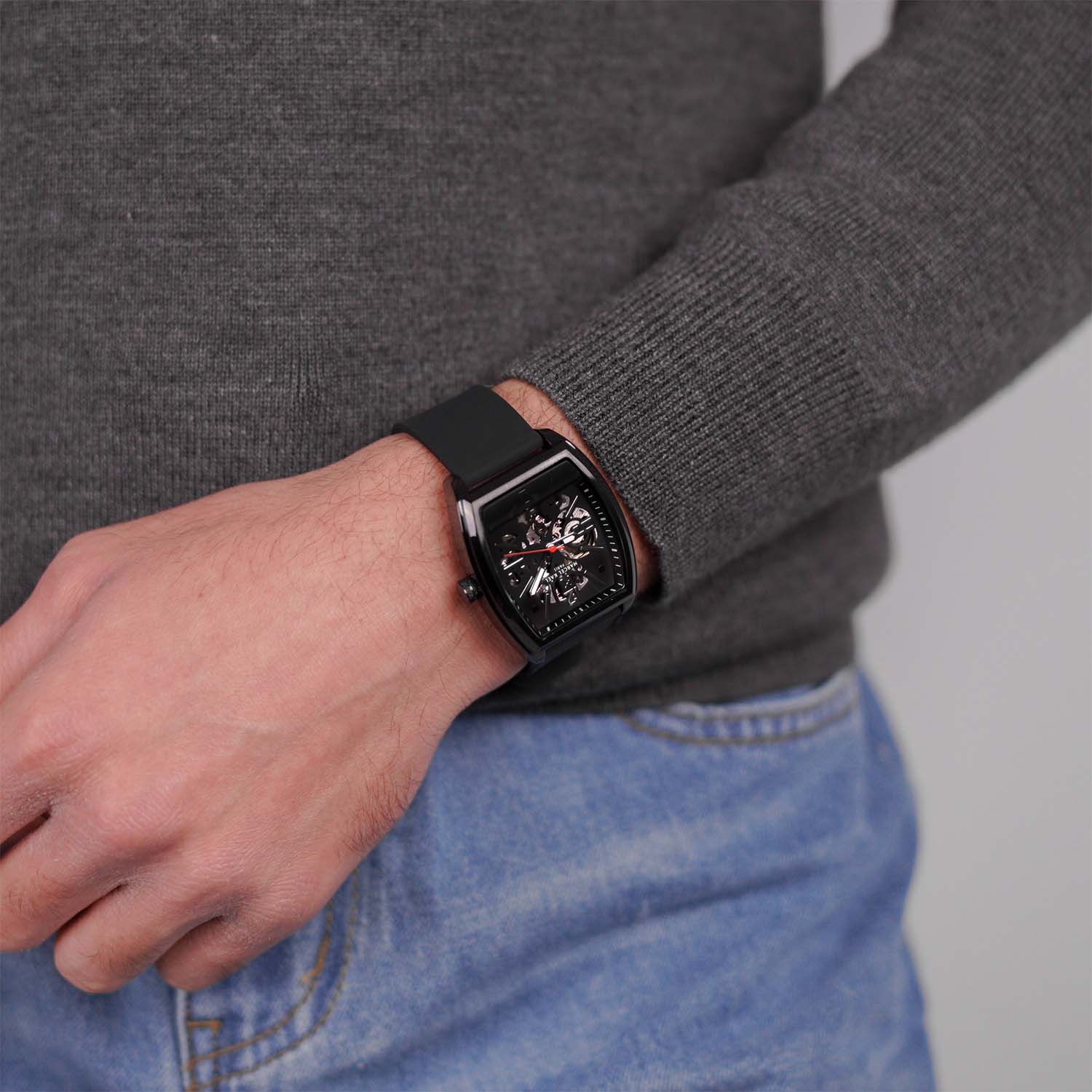 The Leontar Automatic Skeleton commands attention with its tonneau-shaped brushed stainless-steel case and open-worked dial, revealing the mechanics within. Powered by a self-winding movement and paired with a bold black strap, Leontar embodies strength, precision, and timeless style.