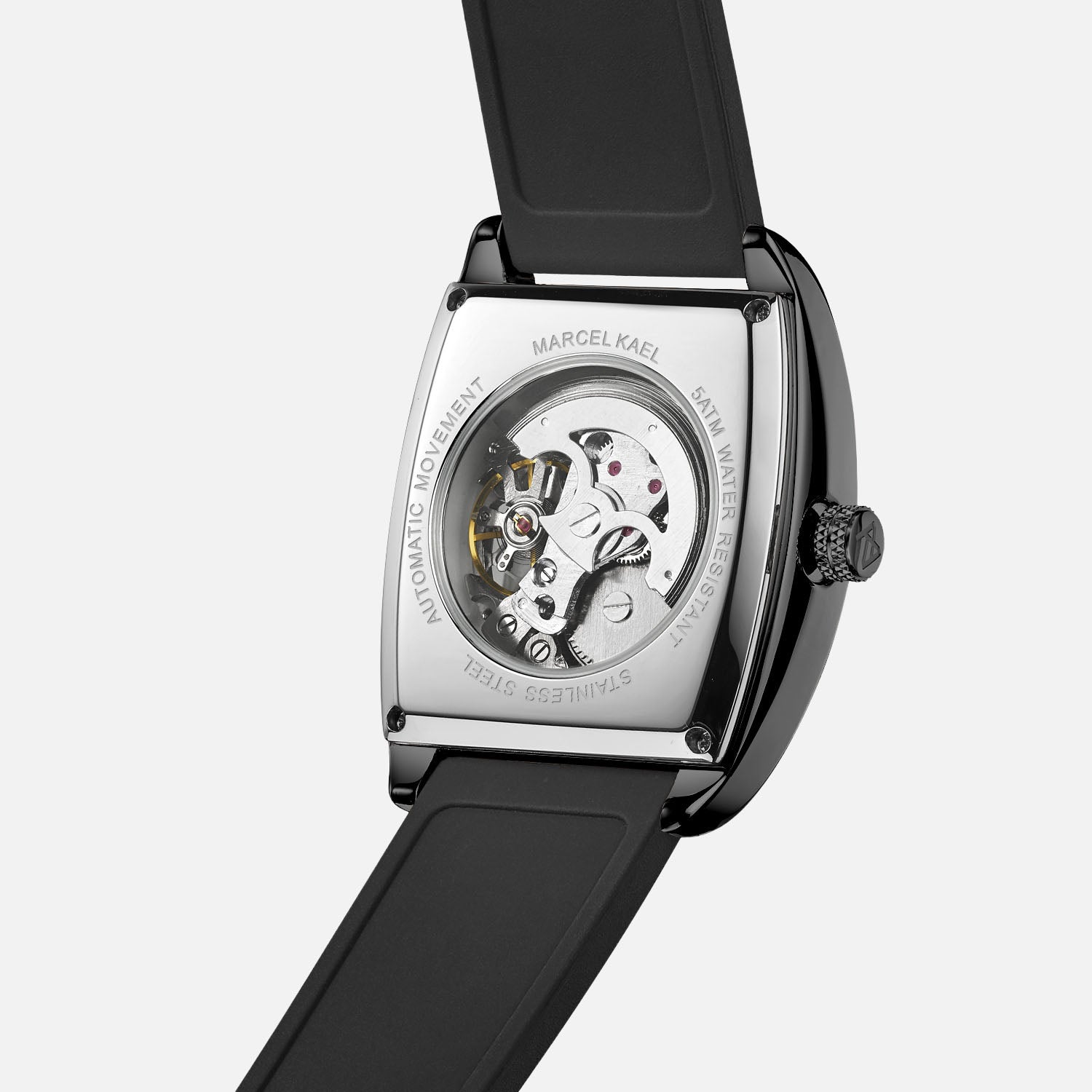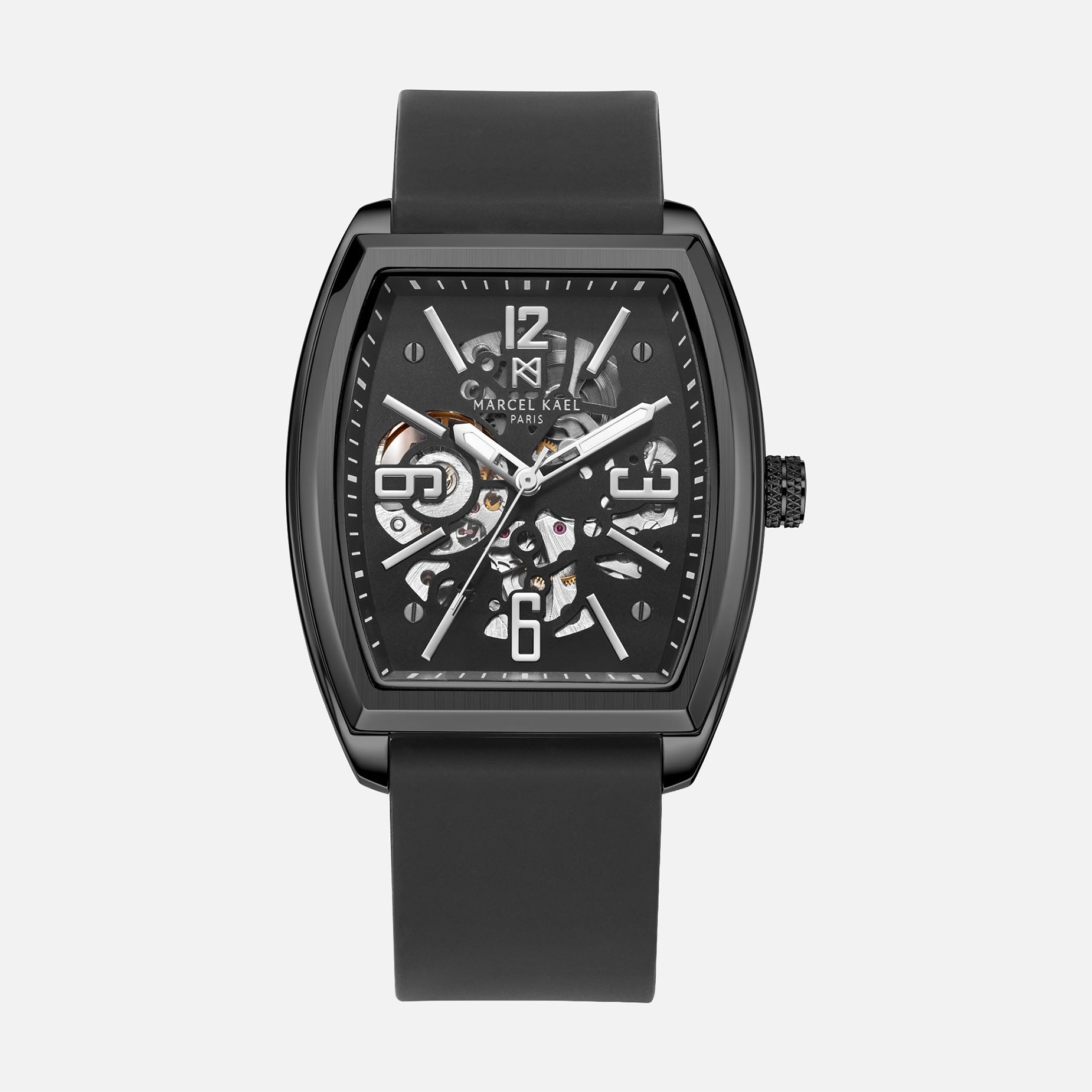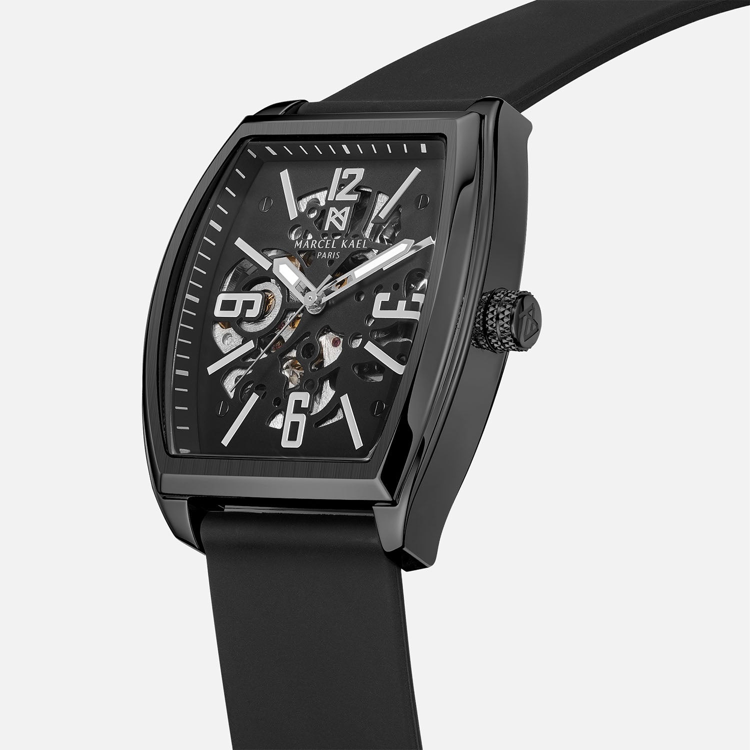 The Leontar Automatic Skeleton commands attention with its tonneau-shaped brushed stainless-steel case and open-worked dial, revealing the mechanics within. Powered by a self-winding movement and paired with a bold black strap, Leontar embodies strength, precision, and timeless style.